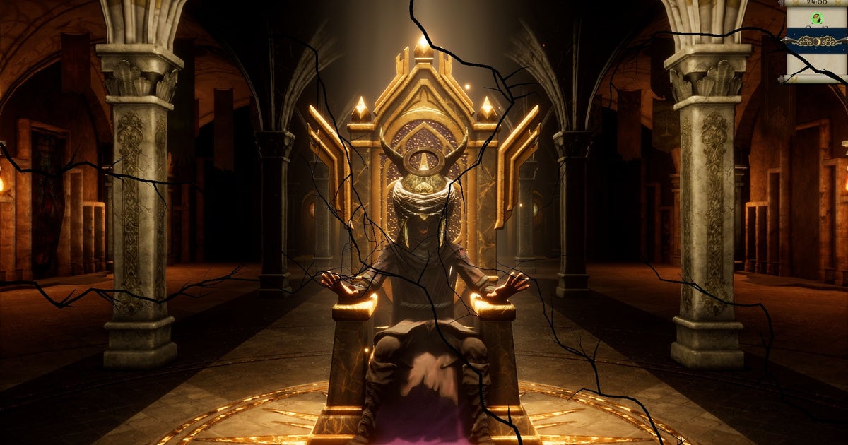 Masters Of Albion is a hodgepodge of influences, a greatest hits of the ideas in many Lionhead Studios and Bullfrog Productions games. Its opening, in which your cloaked figure walks through a misty forest in third-person and stumbles upon a ruined and overgrown village feels straight out of Fable – especially as you’re immediately given the option to kick a chicken, sending it soaring through the air, trailing clucks behind it. In the village you discover a glowing crypt and, inside it, an ancient throne. You sit, put on a magical crown, and give up your body to become a god.